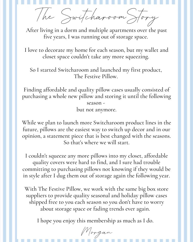 With the launch of Switcharoom's first product, The Festive Pillow, this girl-power duo spends their time curating & designing pillow covers that are festive and timeless for each season and holiday.